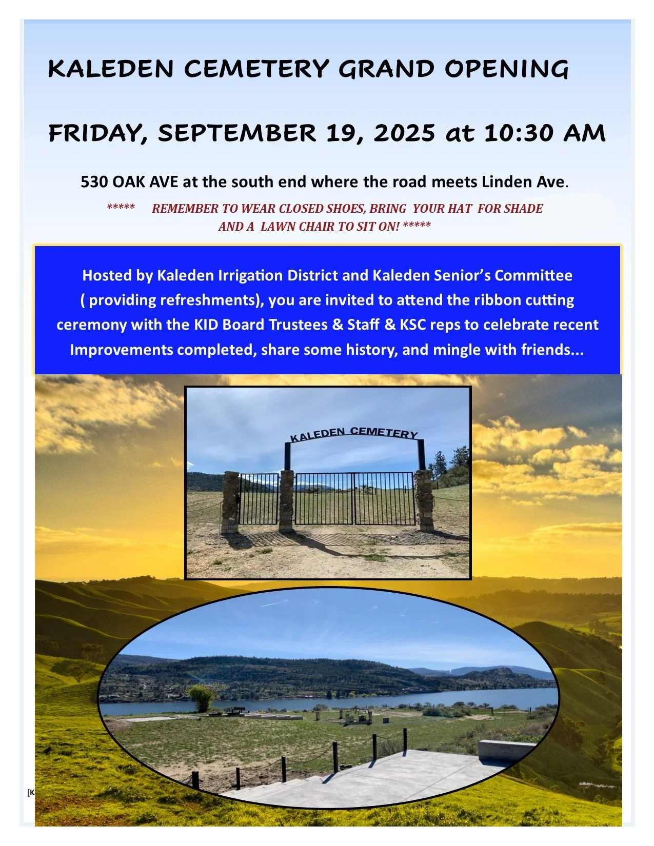 The Kaleden Irrigation District over the past couple of years has embarked on two projects in the Kaleden Cemetery which overall enhance the beauty of the cemetery. One is the gate project and the other is the contemplation seating area. Funding was acquired through donations, grants and KID budget funding. A lot of time and effort was put in by numerous people. We are having a RIBBON CUTTING CEREMONY on location on September 19th, 2025 and wish to invite you!! This will be an opportunity to share memories and stories and enjoy some coffee / cake and goodies! Further information forthcoming!